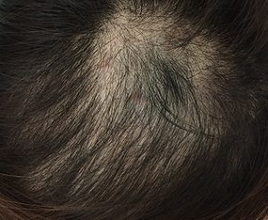 残念ながらスプレーした後の写真は残していなかったのですが、こんな感じの箇所にスプレーしていました。写真で見るとちょっと黒く写っていますが、実際はかなり頭皮が露出している状態でした。